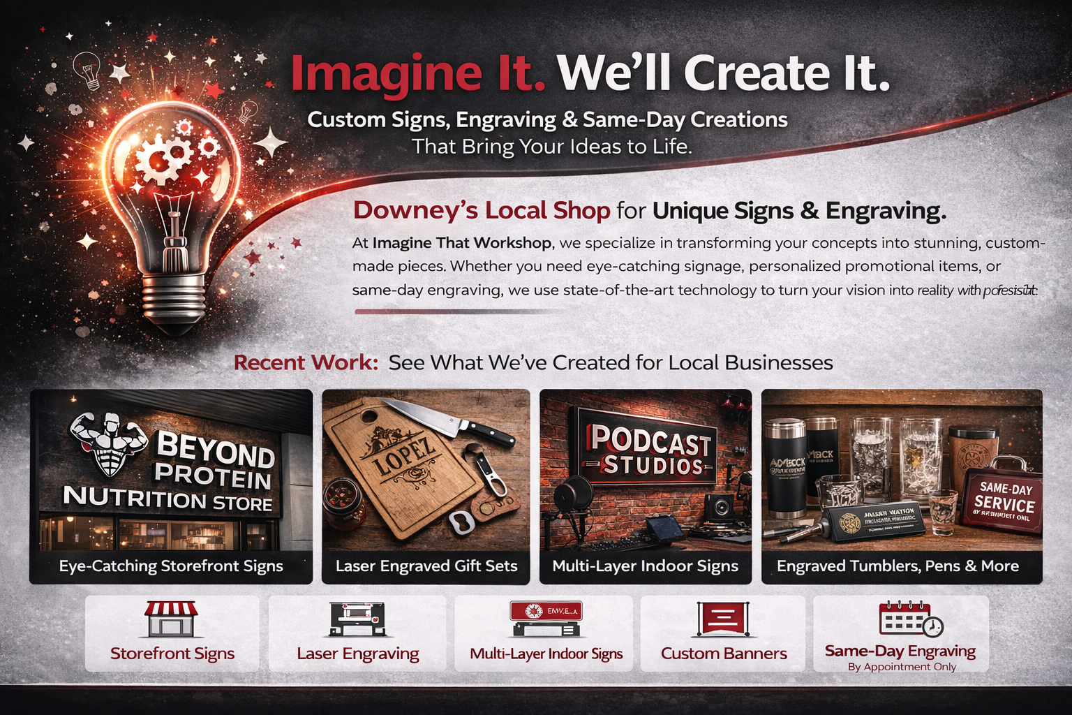 At Imagine That Workshop, we know every business is one-of-a-kind. That's why we offer customized solutions designed just for you—because why settle for one-size-fits-all? We partner with you, bringing years of craftsmanship and a love for innovation to each project. Let us help your business shine with our custom-made, top-notch products!
